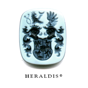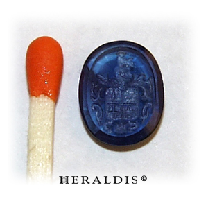 Sehr aussergewöhnliches Ensample. Ein gebogener Stein im gleichen Radius wie die Weißgoldene Fassung passend geschliffen und mit einem Familienwappen graviert.