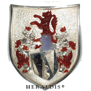 Die einzelnen Bestandteile sind vollplastisch in Onix, Karneol und Calcedon gearbeitet. Das Wappen ist dann mit den Bestandteilen aus Silber und Edelsteinen zusammengesetzt.