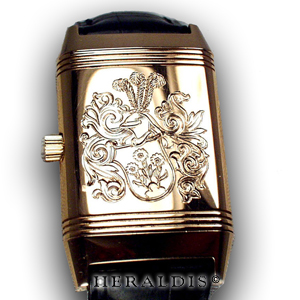 Diese Uhr die beidseitig getragen werden kann wurde von Heraldis mit dem Familienwappen des Eigentümer veredelt.