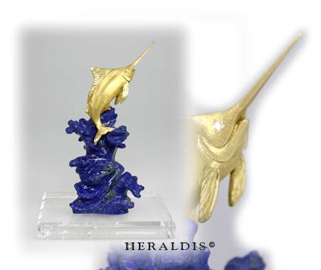 Der Traum jeden Hochseefischers. Dieser Marlin wurde für einen honorierten Hochssefischer gearbeitet. Der goldene Fisch springt aus der Welle die in Lapis-Lazuli gearbeitet ist. Sehr dekorativ auf einem Bergkristallfuß. Limitierte Kollektion von Heraldis 1950€