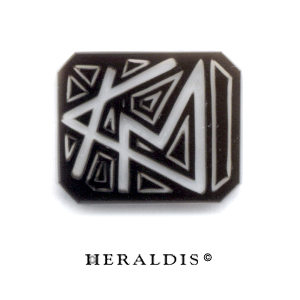 Vom Kunden entworfen. Ein achteckiger Lagenstein oben dunkelbraun, die untere Lage weiß. Die vertiefte Gravur kommt weiß zu Vorschein.