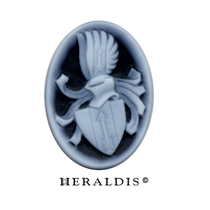 In eine große Jaspisplatte in Wappenform wurde das Familienwappen eingraviert und aufwendig mit Feingold ausgelegt. Dieser Wappenstein wurde dann in eine dekorative Holzschatulle eingelassen. Ein Schmuckstück für den Schreibtisch.