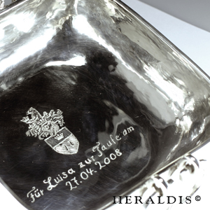 Das Familienwappen wurde in der Innenseite des Gefäßes eingraviert. Sehr schöne Wirkung.